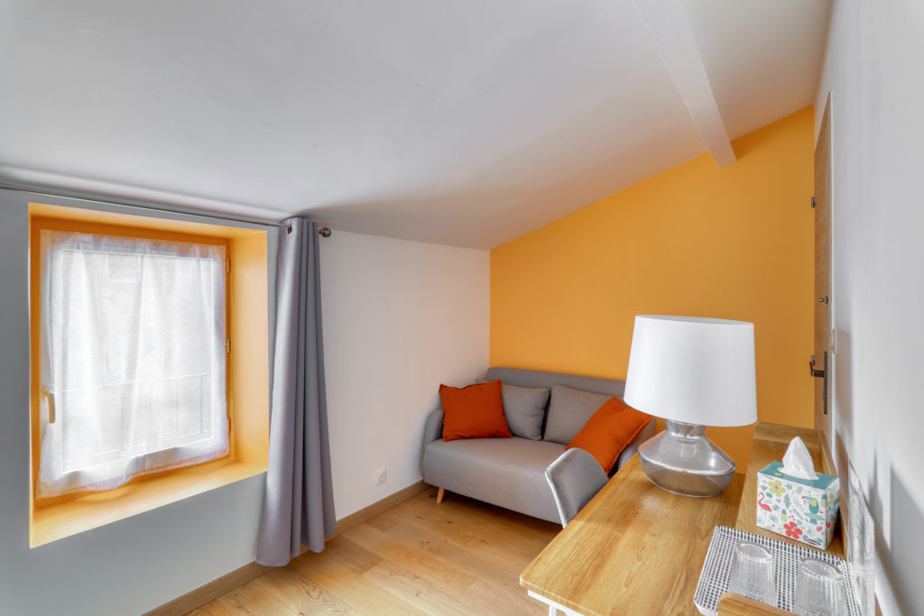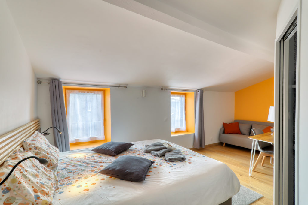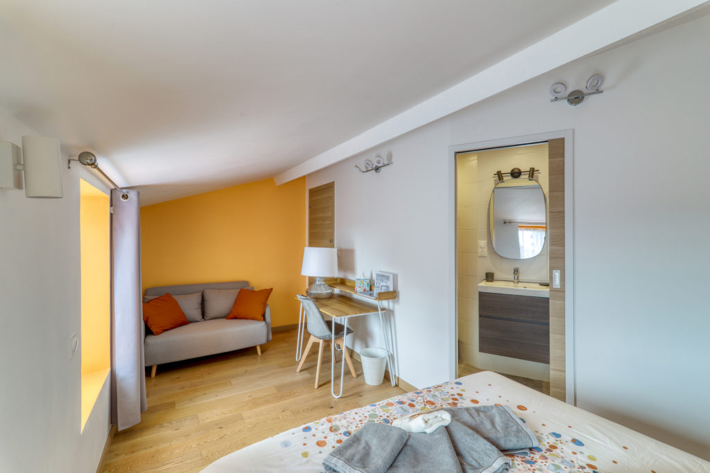 La chambre est climatisée et se compose d’un lit double de 160 cm x 200 cm, ainsi que d’un canapé convertible en lit supplémentaire de 120 cm x 200 cm pour 1 adulte ou 2 enfants de 10-12 ans. Chacun des lits dispose d’une literie de qualité, avec des matelas à mémoire de forme.