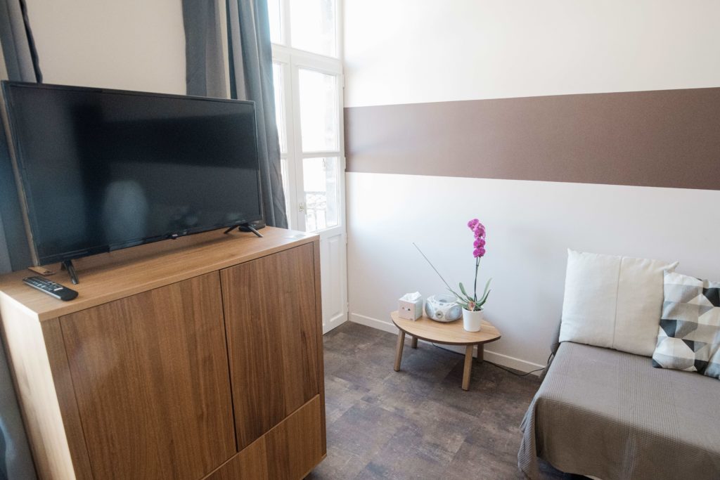 L’espace de vie très lumineux comprend une salle à manger, un salon avec télé et canapé-lit pour 2 personnes.