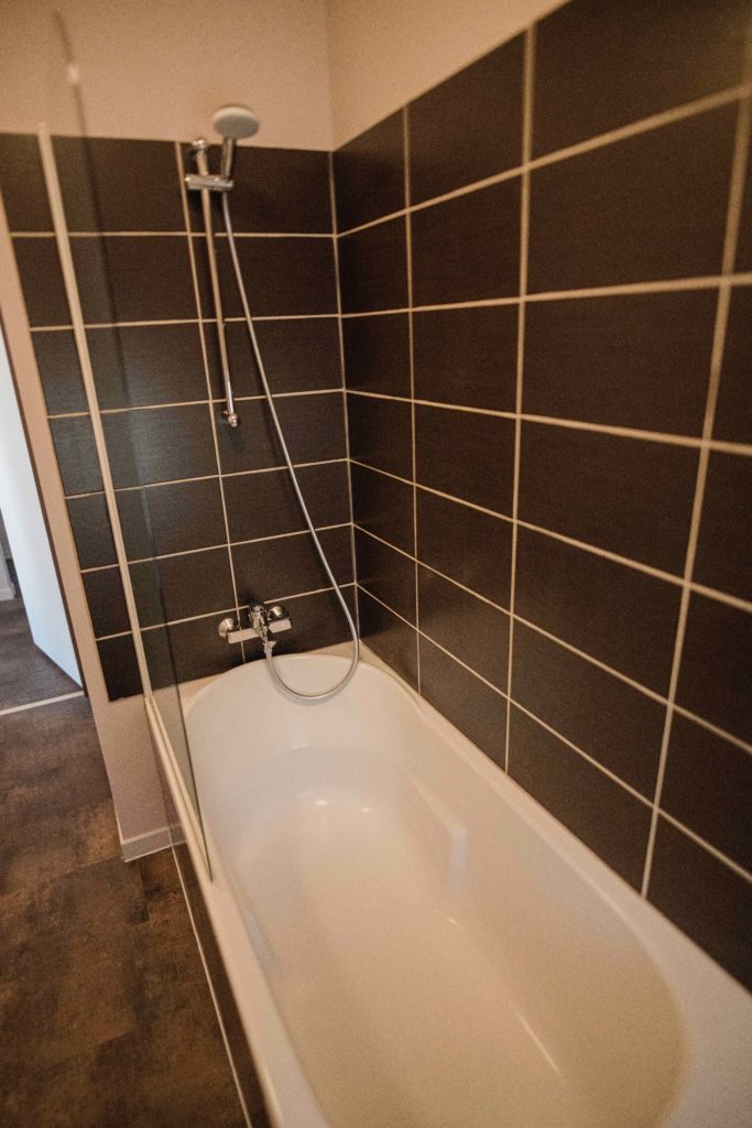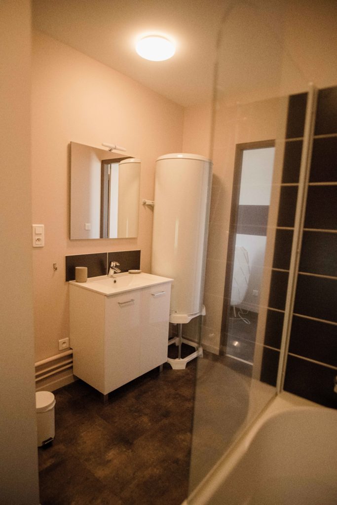 La salle de bain comprend 1 baignoire, 1 meuble-vasque, 1 miroir, 1 sèche-serviettes.